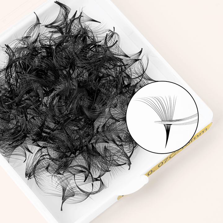 1. Die vorgefertigten Volumenfächer von KOLYBEL mit schmaler Basis und mittlerem Stiel sind perfekt für Volumenwimpern mit einem weichen, natürlichen Touch.